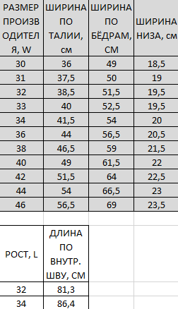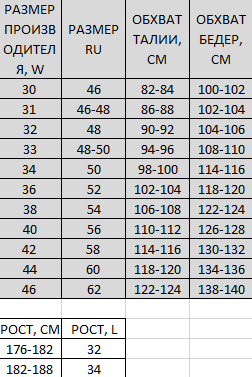 Таблица размеров